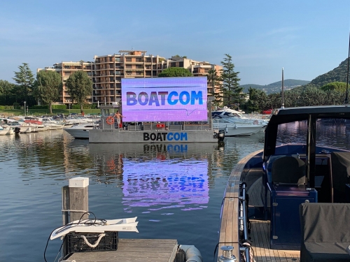 BOATCOM, un concept unique en Europe (technologie Pixelight). BOATCOM est un bateau conçu pour recevoir un écran géant pour vos événements ou communiquer au bord des plages !